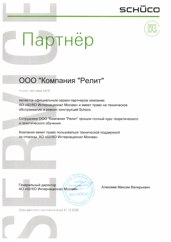 Одним из видов деятельности «Компании «Релит» является ремонт пластиковых окон, произведенных из профиля и комплектующих фирмы Шуко (Schuco), как пластиковых, так и алюминиевых. Политика продаж ЗАО «Шуко Интернационал Москва» такова: эта компания сотрудничает только с избранным кругом компаний и заслужить сертификат на ремонт окон, нам удалось своим трудом и безупречной репутацией.